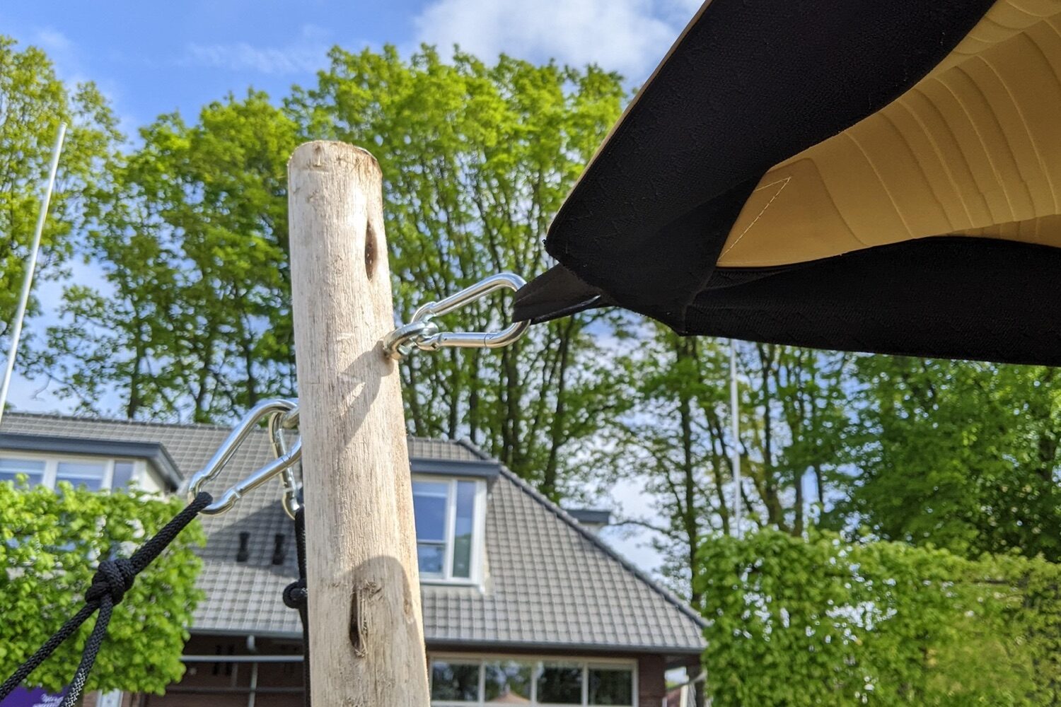 Aan deze lus worden de palen en scheerlijnen vastgezet met karabijnhaken.