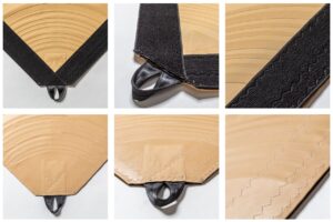 De zeilen van de stretchtenten met lusverbinding hebben rondom lussen om de 75cm van oersterk gordelband waar de karabijnhaak aangeklikt wordt. Deze karabijnhaak wordt vastgezet aan de oogbouten aan de palen, hierdoor is de bevestiging van de zeilen extreem sterk.