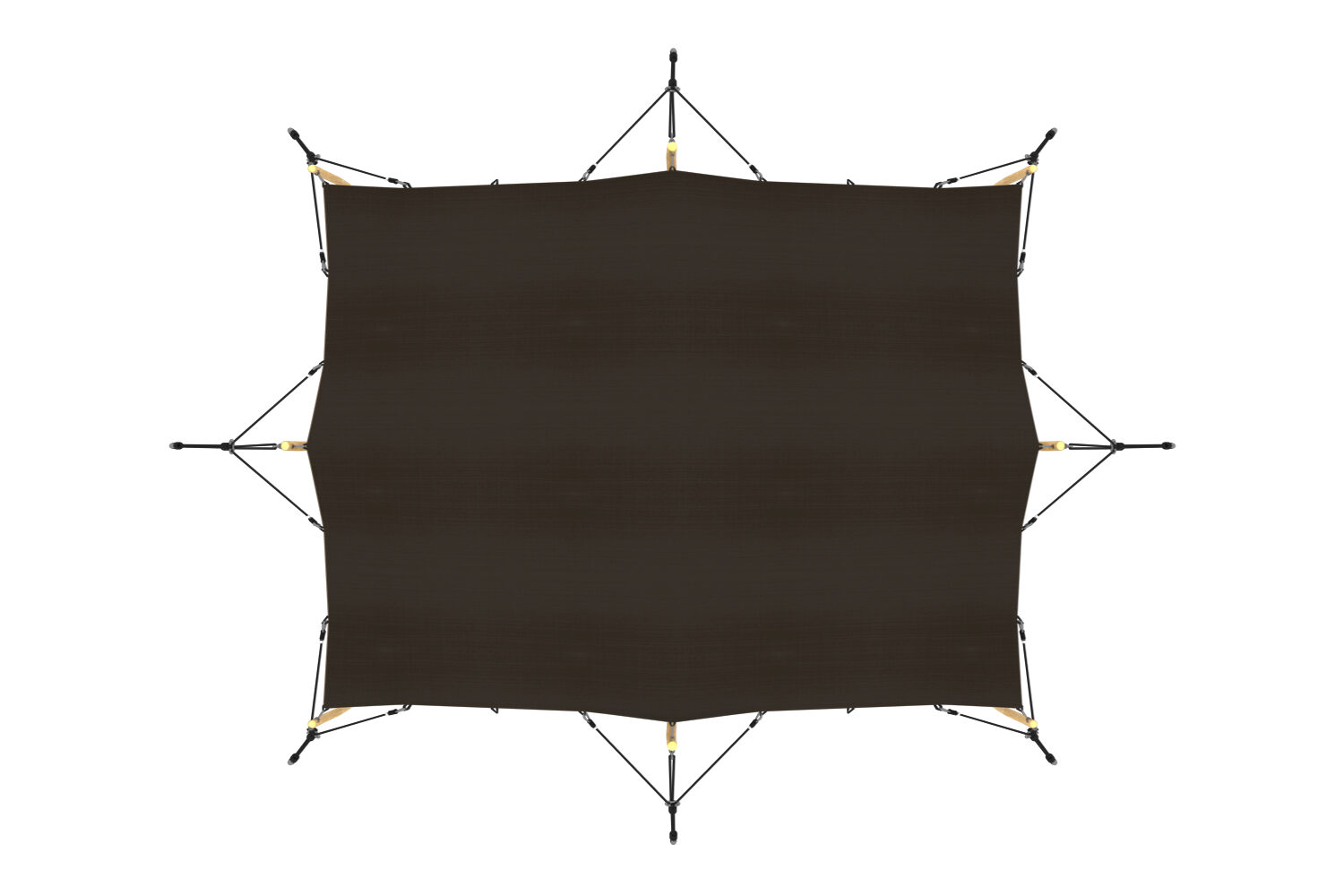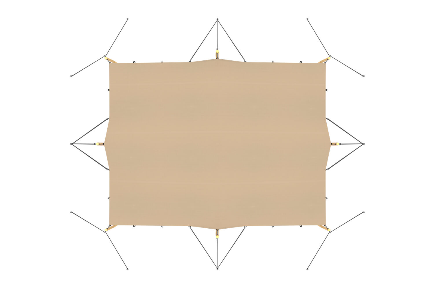 Met de meegeleverde onderdelen en bevestigingsmaterialen is deze opstelling het meest gebruikelijk voor het correct opzetten van de stretchtent met touwensets. Alle benodigde onderdelen voor het correct bevestigen van de stretchtent worden meegeleverd.