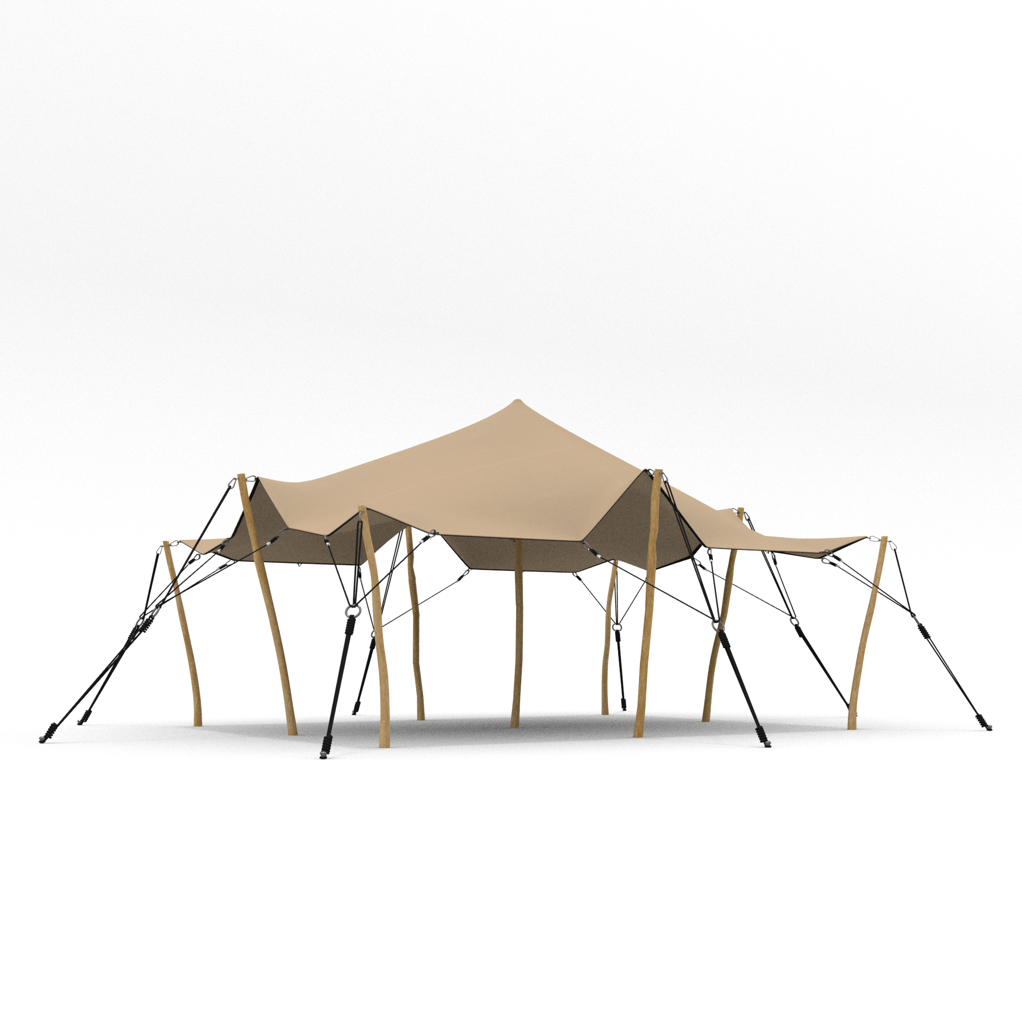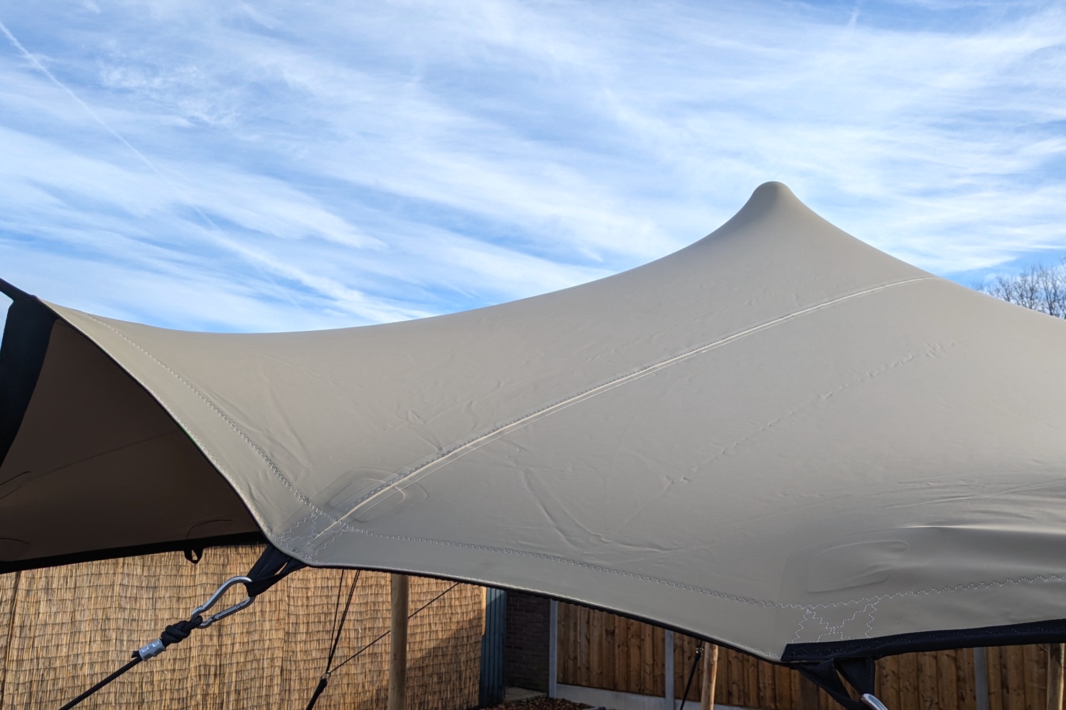 Aan de linker- en rechterkant van de palen worden ook karabijnhaken bevestigd aan het doek, met behulp van touw of spanbanden, om het doek strak te trekken en de gewenste vorm te creëren.