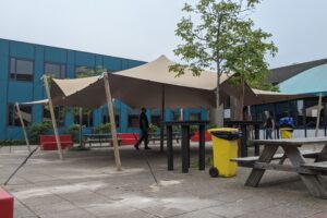 De zeilen van de stretchtenten met lusverbinding hebben rondom lussen van oersterk gordelband waar de karabijnhaak aangeklikt wordt. Deze karabijnhaak wordt vastgezet aan de oogbouten aan de palen, hierdoor is de bevestiging van de zeilen extreem sterk.