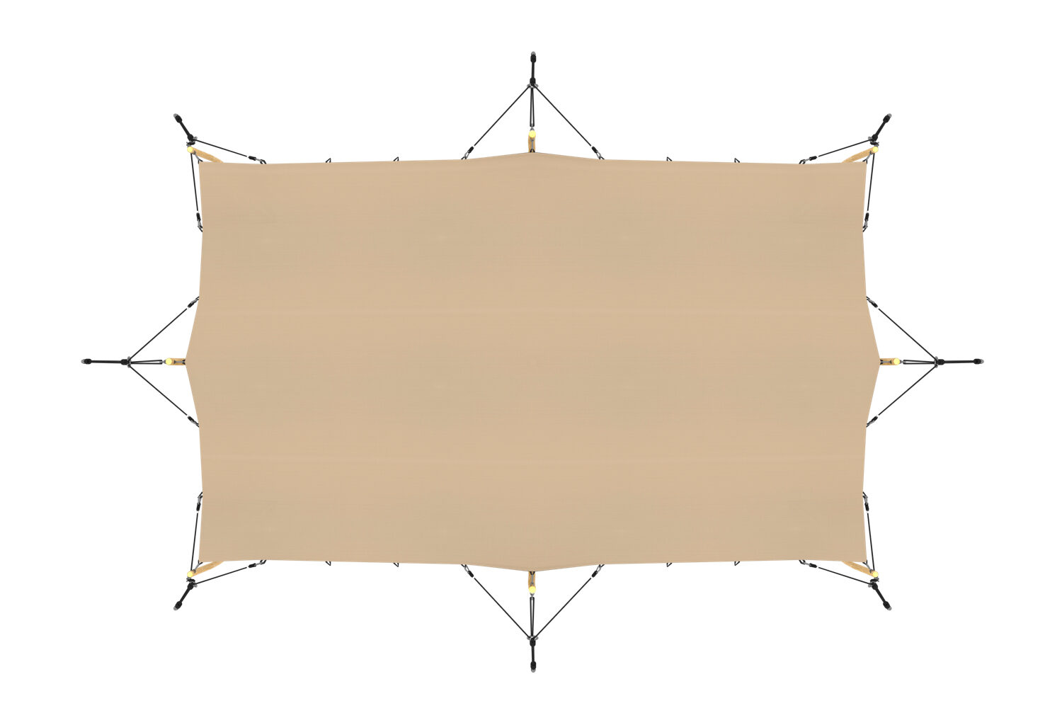 De A.W.A.T. technologie van de stretchtent maakt gebruik van een organische barrière die voorkomt dat water wordt geabsorbeerd, waardoor het doek volledig waterdicht en afstotend is.