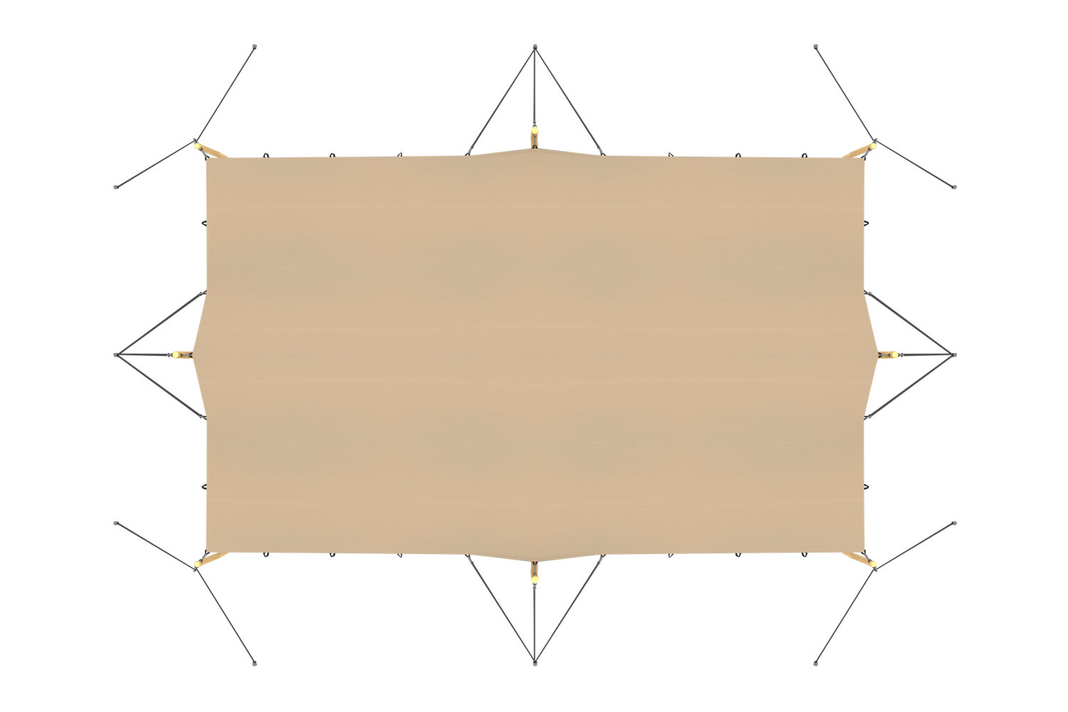 Met de meegeleverde onderdelen en bevestigingsmaterialen is deze setup het meest gangbaar voor de variant met de touwensets. Alle onderdelen om de stretchtent correct op te zetten worden meegeleverd. Tip: Plaats de haringen minimaal 2 meter buiten de tent en trek de touwen zeer strak aan.