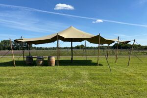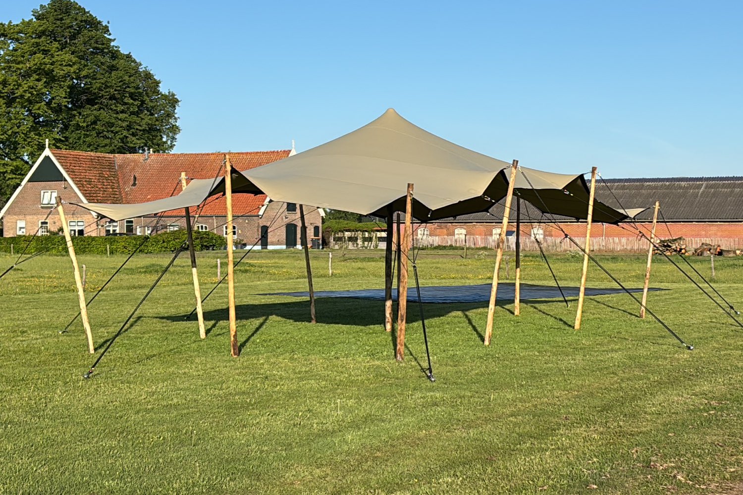 De stretchtent wordt compleet geleverd inclusief alle benodigdheden om deze op te zetten.