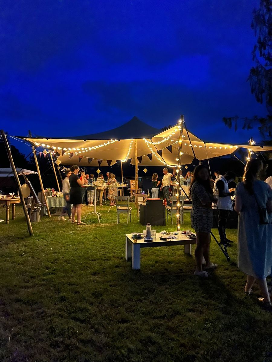 Stretchtenten zijn oneindig te koppelen via een speciale goot, vastgemaakt met karabijnhaken en klittenband voor een waterdichte en esthetisch aantrekkelijke verbinding.