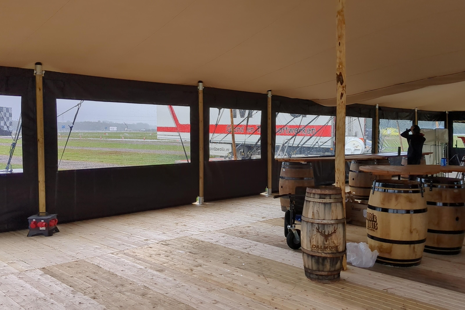 Deze matzwarte zijwand voor stretchtenten maakt je tent water- en winddicht met heldere vensterfolie, heeft afmetingen van 3m tussen ritsen (245cm hoog), en is gemaakt van PVC 580gr/m2 met robuuste bevestigingspunten en ritsen.