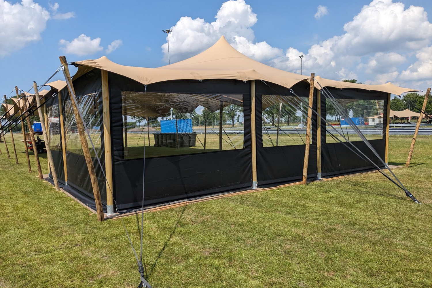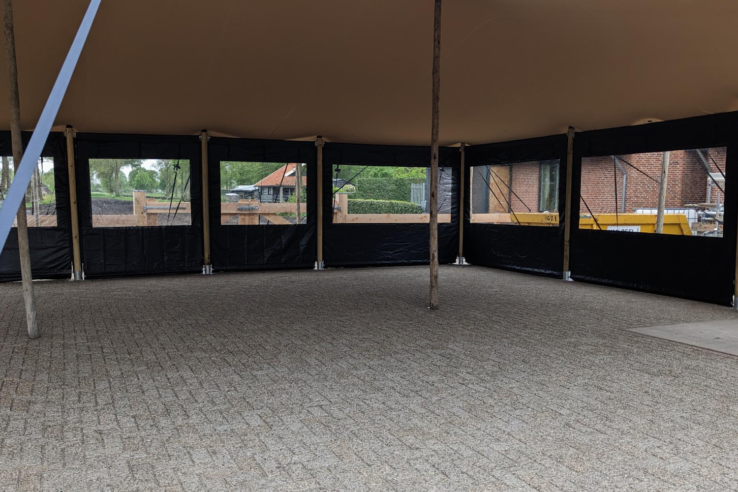 *) Na het bevestigen van alle zeilen moet er worden nagelopen of de zeilen niet naar buiten kunnen worden geduwd. Is dit op plekken het geval, dan moet het doek van de stretchtent strakker over de buis van de zijwanden worden getrokken door middel van de spanbanden en schroefogen die in de houten palen zitten.