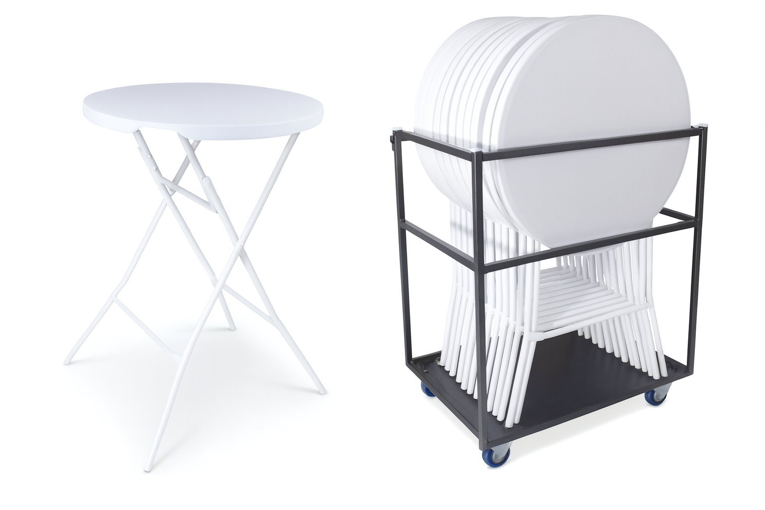 De meegeleverde trolley maakt het vervoeren en opslaan van de statafels eenvoudig. Dankzij de smalle afmetingen past de kar zelfs door een standaard deuropening. Voorzien van stevige zwenk- en bokwielen (met rem), zodat je de trolley veilig en soepel kunt verplaatsen.