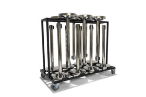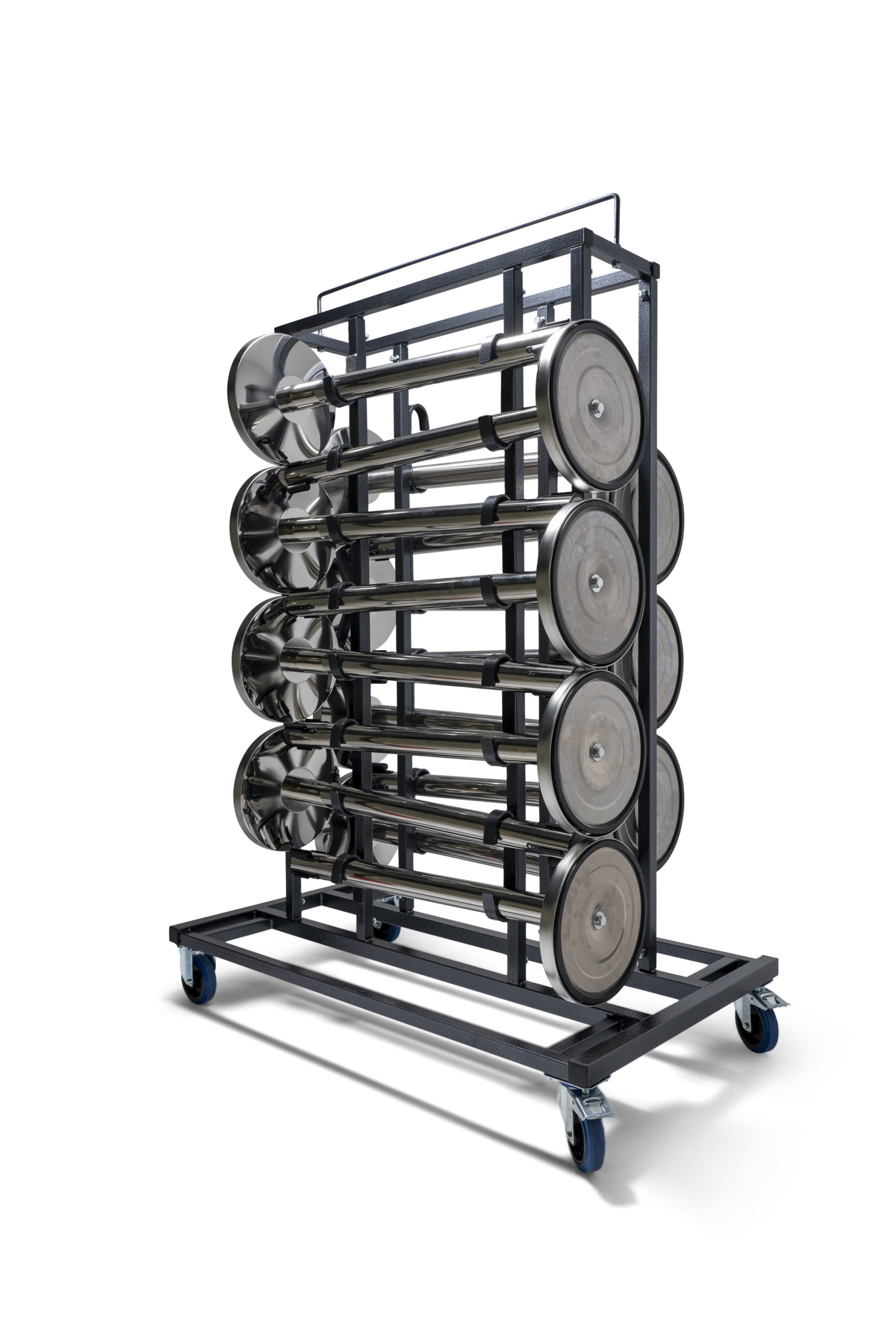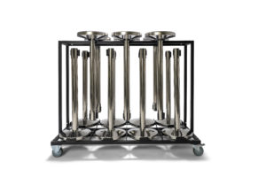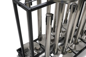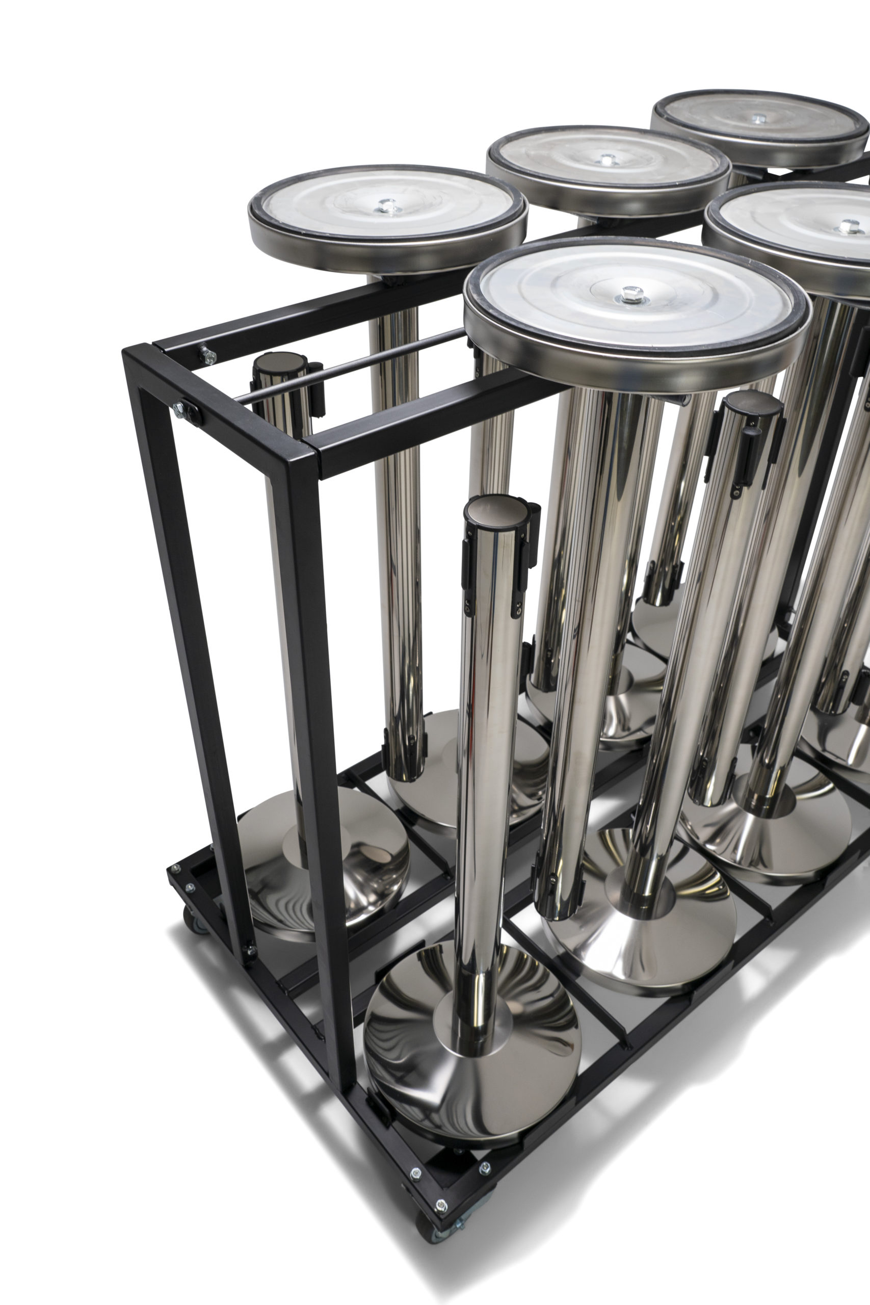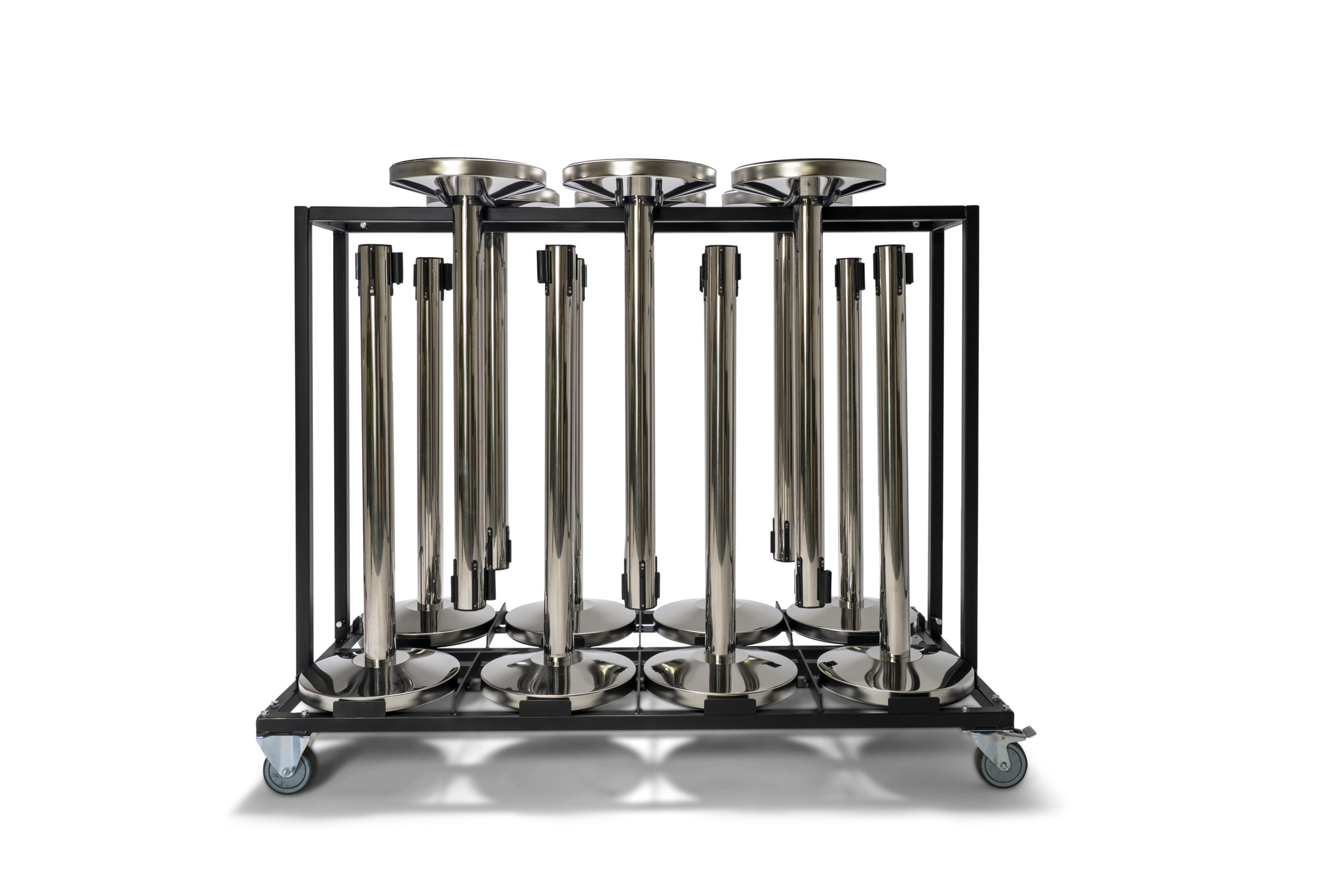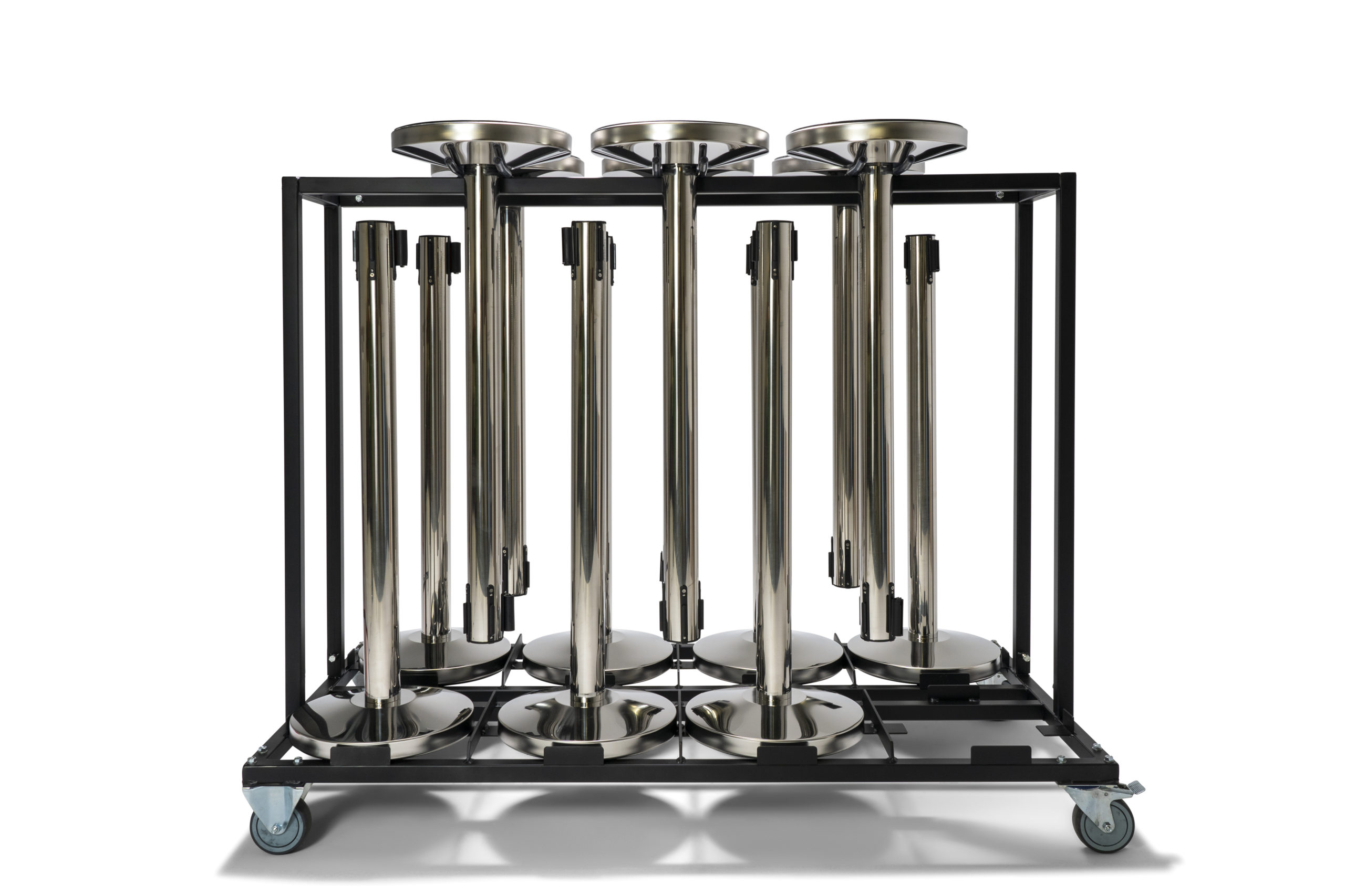 Op deze transportkar passen alle soorten afzetpalen. Ideaal wanneer je meerdere soorten wilt vervoeren. Totaal passen er 14 afzetpalen op de transport trolley. Je kunt de losse koorden eenvoudig aan de horizontale middenbuis hangen zodat deze ook vervoerd kunnen worden. De dragers voor de afzetpalen die ondersteboven hangen zijn voorzien van beschermrubber om schade aan de afzetpaal te voorkomen.