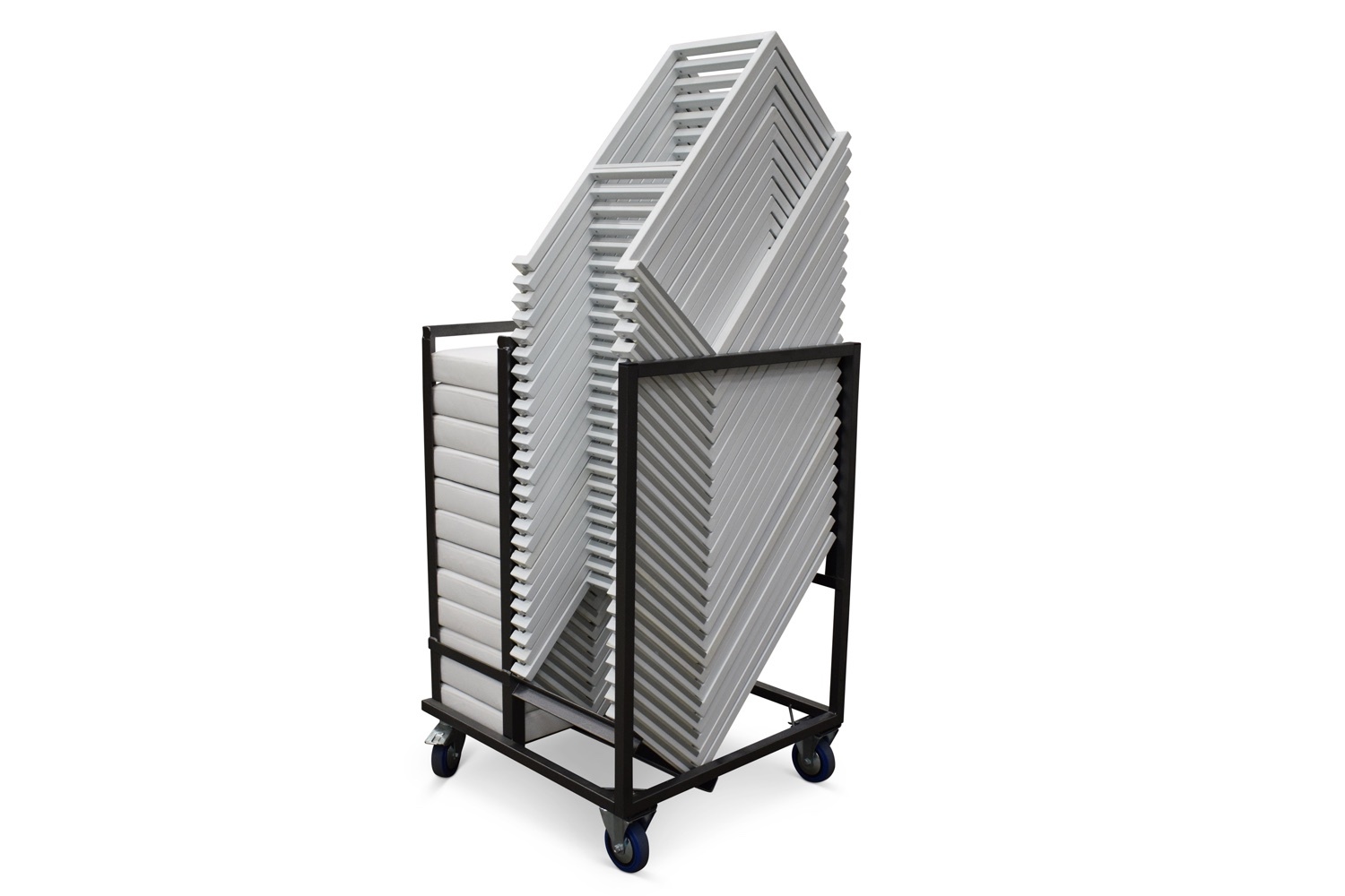 Erg gemakkelijk als je ze vaak moet verplaatsen of voor verhuurbedrijven die ze constant in en uit moeten laden. De transportkar beschikt over 4 wielen waarvan er 2 bokwielen en 2 zwenkwielen met rem zijn. De wielen hebben een diameter van 125mm. De trolley is gemaakt van kokerprofiel en wordt volledig in elkaar gelast geleverd.