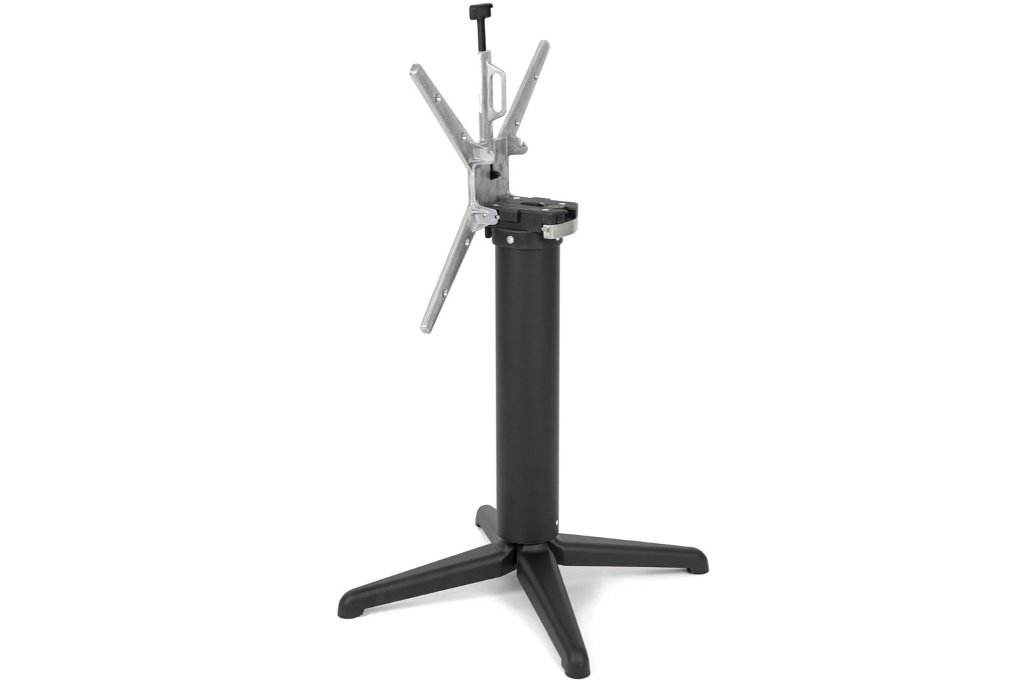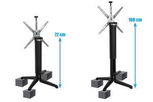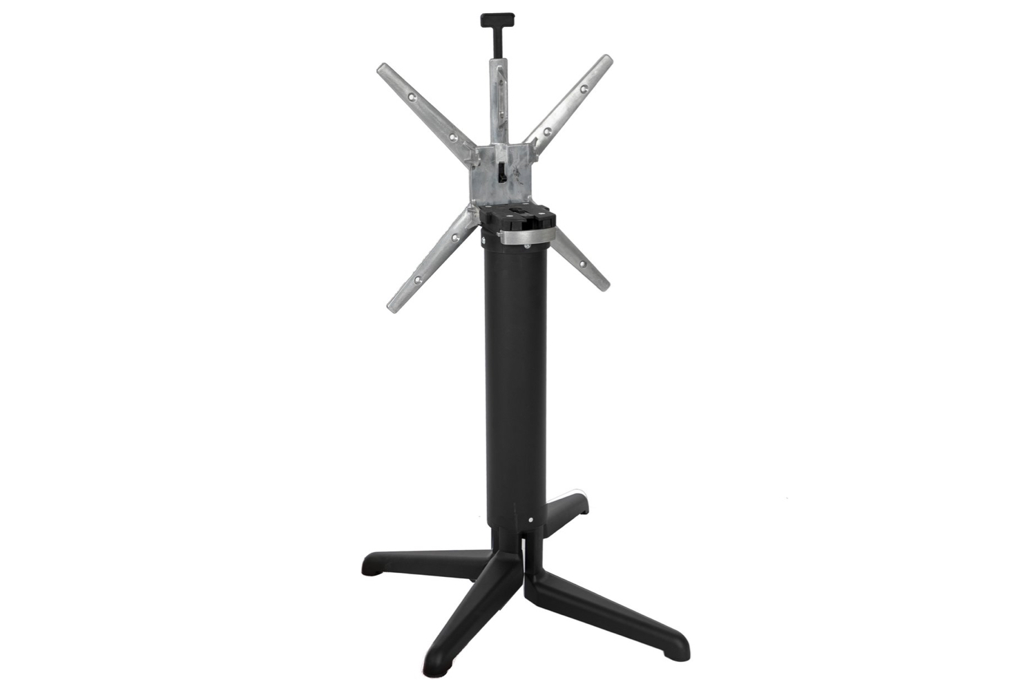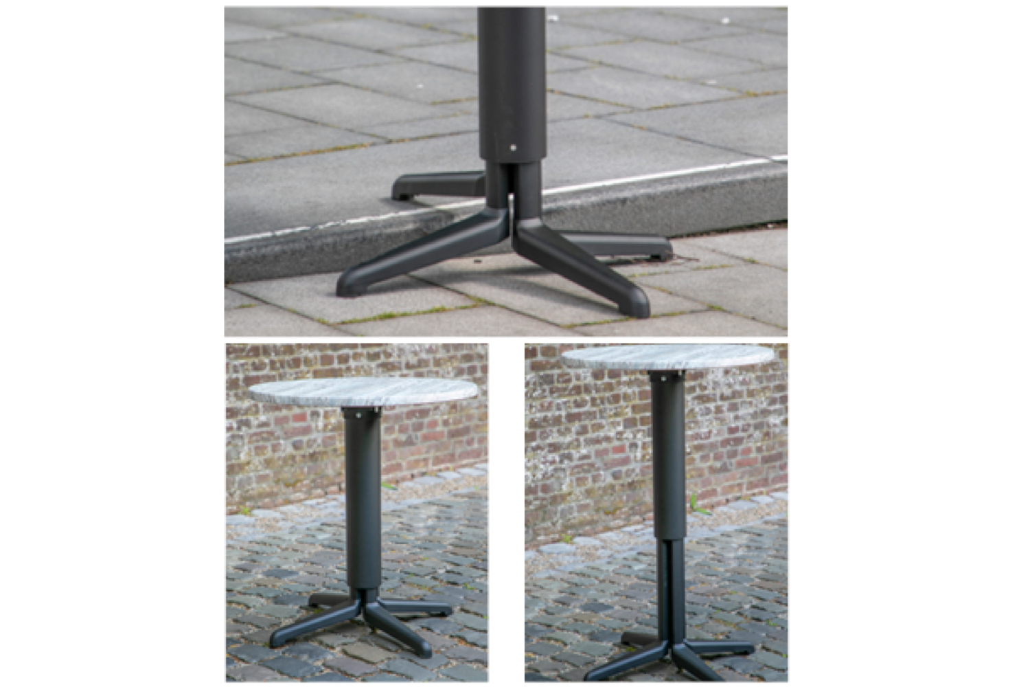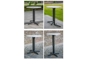 Het onderstel is gemaakt van aluminium en mat zwart gepoedercoat. Elke stelvoet van het onderstel beschikt over rubberen doppen onderaan de stelvoeten en is geschikt voor bladen van 60x60cm tot 80x80cm. Ook ronde bladen van ⌀70 of ⌀80cm passen er goed op. Het blad kan worden opgeklapt om het compact te kunnen vervoeren en wegzetten.