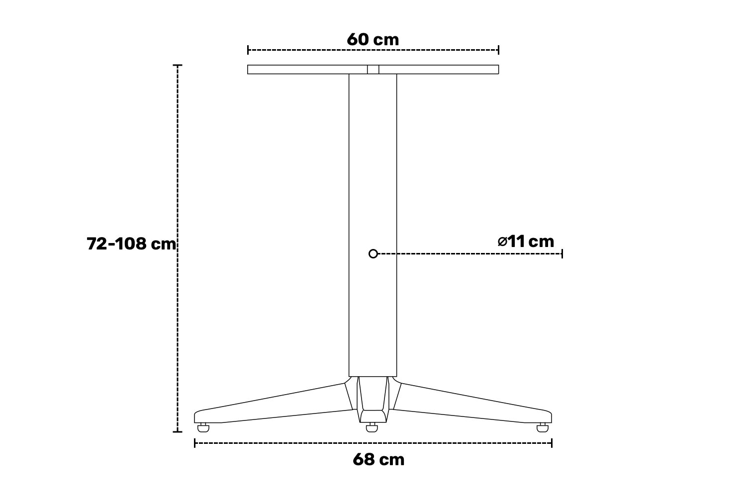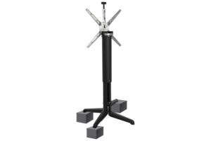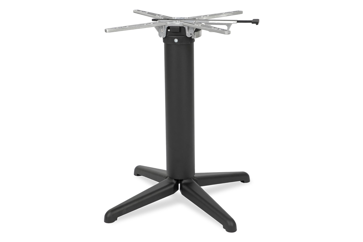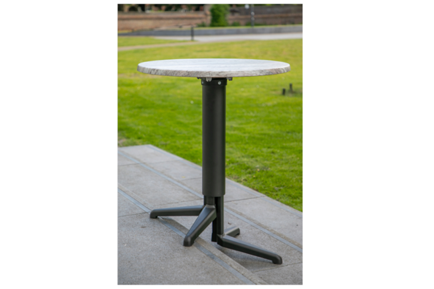 Het onderstel is gemaakt van aluminium en mat zwart gepoedercoat. Elke stelvoet van het onderstel beschikt over rubberen doppen onderaan de stelvoeten en is geschikt voor bladen van 60x60cm tot 80x80cm. Ook ronde bladen van ⌀70 of ⌀80cm passen er goed op. Het blad kan worden opgeklapt om het compact te kunnen vervoeren en wegzetten.
