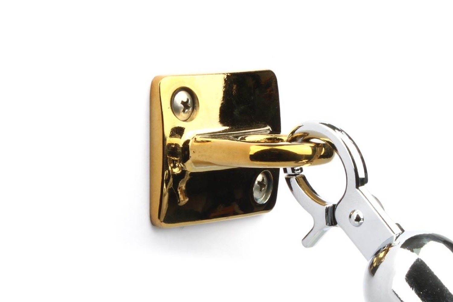 Wil je met je afzetpalen vanaf de muur beginnen dan is de wandhaak daarvoor ideaal. Je klikt eenvoudig het koord eraan en hangt het koord aan eerstvolgende paal. De wandhaak is netjes afgewerkt heeft dezelfde kleur als de messing palen en sluitingen van de koorden.