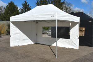Op de hoeken gaat de zijwand volledig om de paal wat een enorme verbetering is in stevige bevestiging van de zeilen, levensduur, winddichtheid en uitstraling. Bij veel aanbieders zitten er ‘slechts’ enkele stukjes klittenband op de uiteinden van de zeilen om ze mee aan de staanders te bevestigen.
