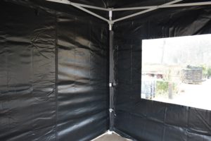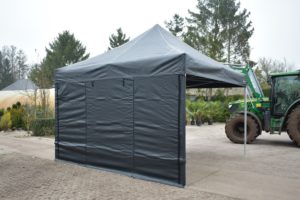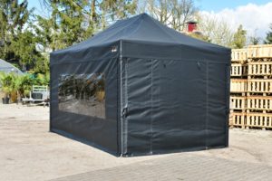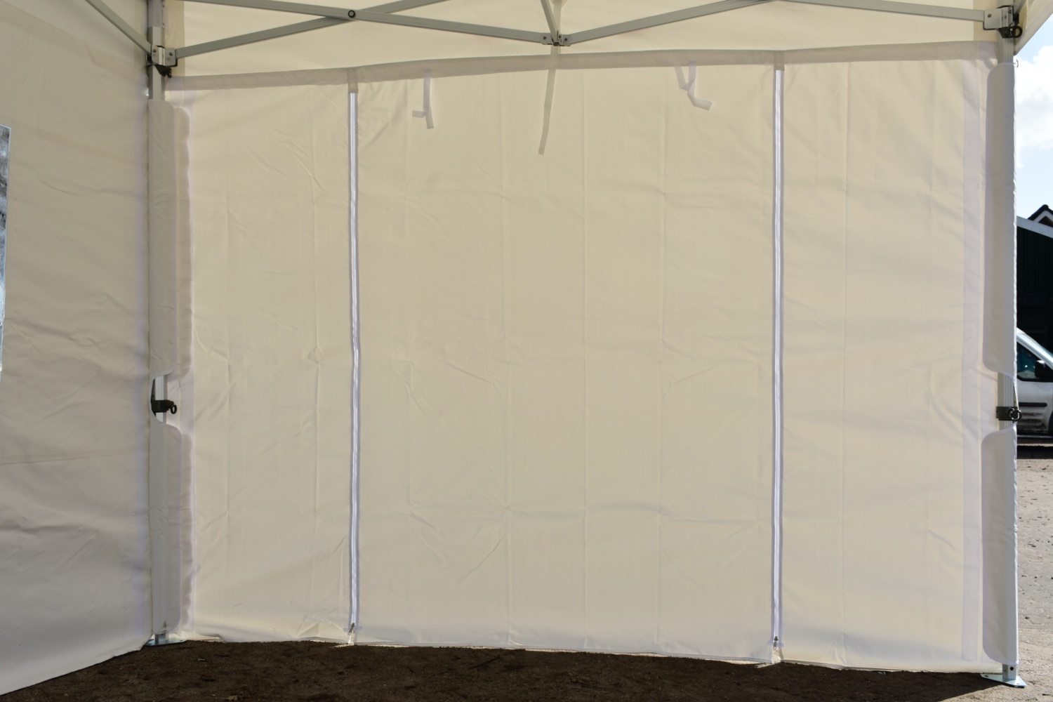 Op de hoeken gaat de zijwand volledig om de paal wat een enorme verbetering is in stevige bevestiging van de zeilen, levensduur, winddichtheid en uitstraling. Bij veel aanbieders zitten er ‘slechts’ enkele stukjes klittenband op de uiteinden van de zeilen om ze mee aan de staanders te bevestigen.