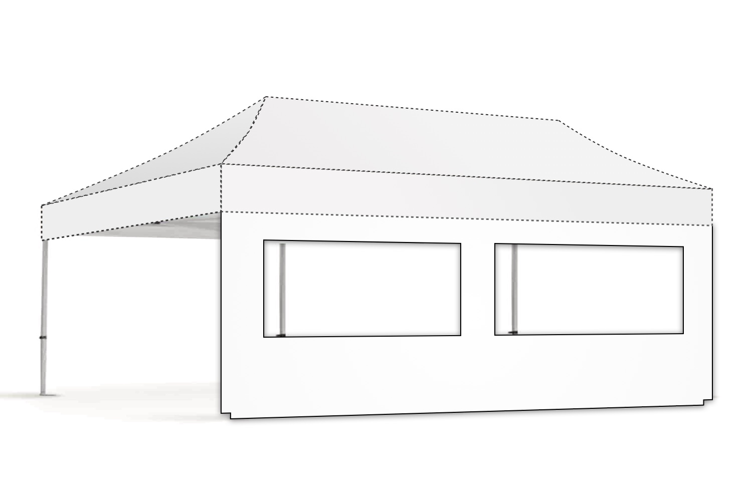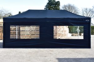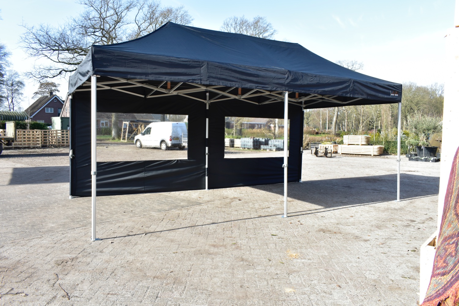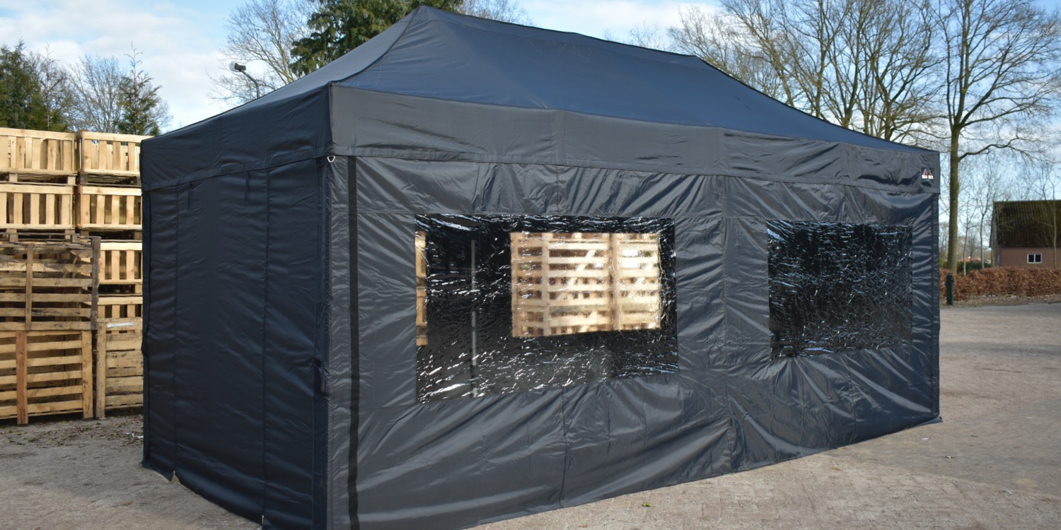 Op de hoeken gaat de zijwand volledig om de paal wat een enorme verbetering is in stevige bevestiging van de zeilen, levensduur, winddichtheid en uitstraling. Bij veel aanbieders zitten er ‘slechts’ enkele stukjes klittenband op de uiteinden van de zeilen om ze mee aan de staanders te bevestigen.