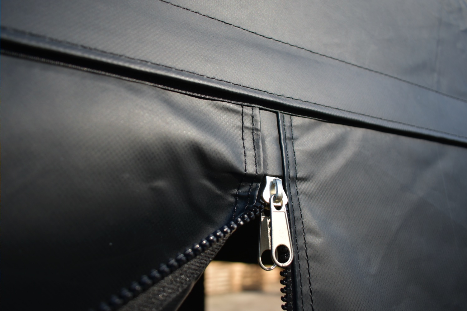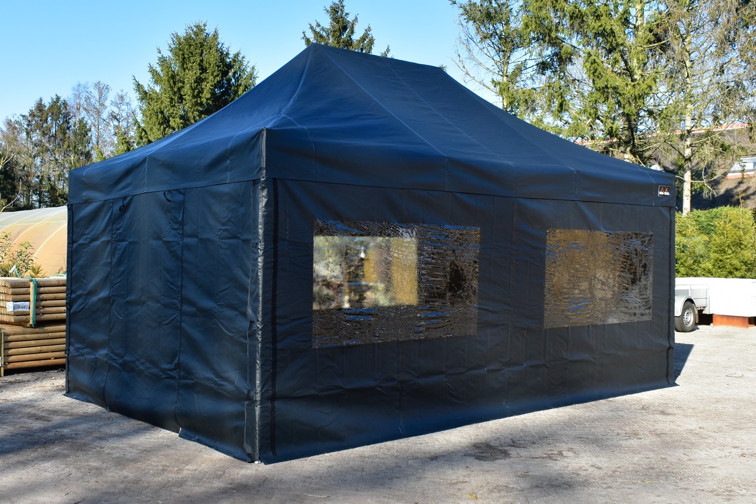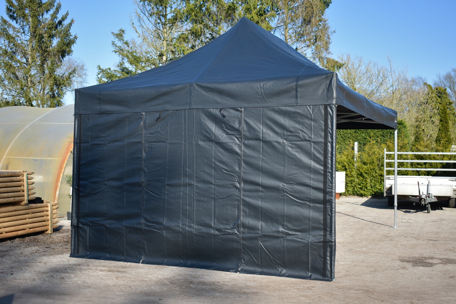 De zijwandenset bestaat uit totaal 4 zeilen. 2 zijwanden van 6 meter met ramen en 2 zijwanden van 4 meter met oproldeur in het midden. De zeilen zijn gemaakt van 100% brandwerend PVC. De naden zijn volledig thermisch gelast. Aan zowel de bovenzijde als zijkanten beschikken alle zeilen over maar liefst 5cm breed degelijk klittenband waarmee ze zeer solide kunnen worden vastgezet aan het dakzeil.