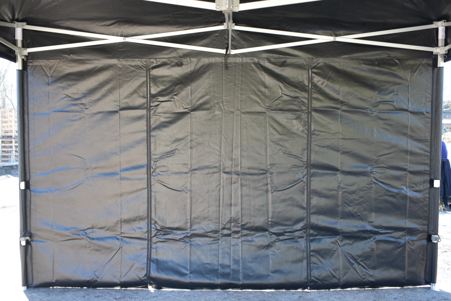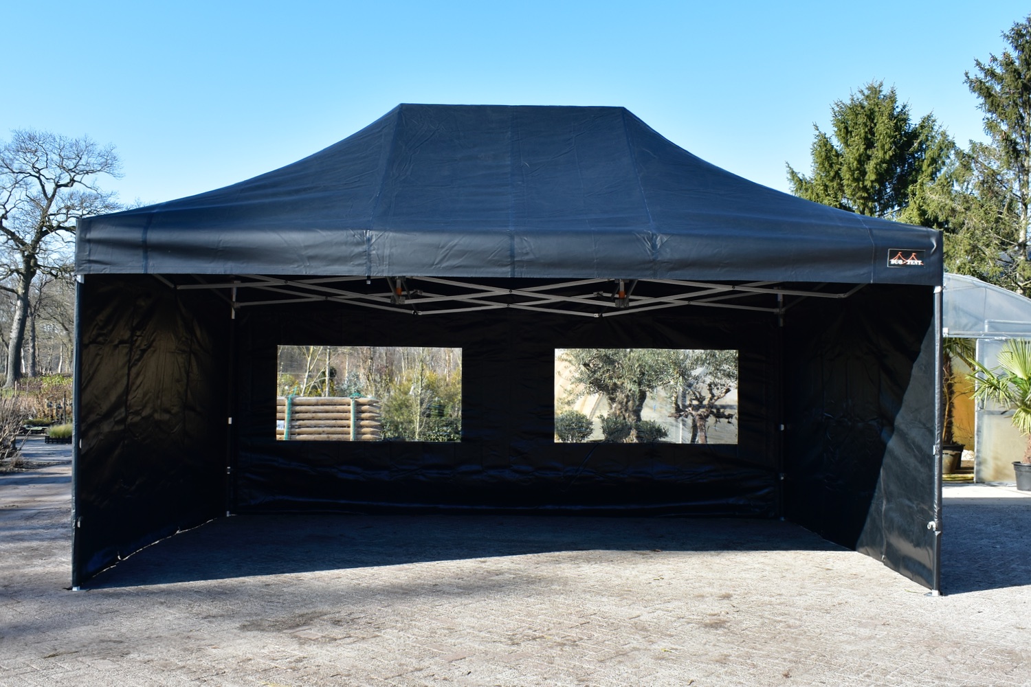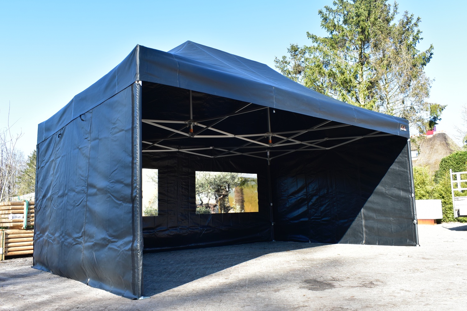 De zijwandenset bestaat uit totaal 4 zeilen. 2 zijwanden van 6 meter met ramen en 2 zijwanden van 4 meter met oproldeur in het midden. De zeilen zijn gemaakt van 100% brandwerend PVC. De naden zijn volledig thermisch gelast. Aan zowel de bovenzijde als zijkanten beschikken alle zeilen over maar liefst 5cm breed degelijk klittenband waarmee ze zeer solide kunnen worden vastgezet aan het dakzeil.